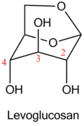 Polymerization of 3,4-epoxy levoglucosan (1,6;3,4-dianhydro-2-O-alkyl-β-D-galactopyranose) results in formation 3,4-bounded levoglucosan polymer.[9]