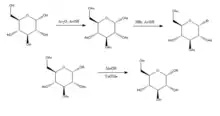Joshi et al. (2006)[6] propose the Koenigs-Knorr reaction in the stereoselective synthesis of alkyl D-glucopyranosides via glycosylation, with the exception of using lithium carbonate which is less expensive and toxic than the conventional method of using silver or mercury salts. D-glucose is first protected by forming the peracetate by addition of acetic anhydride in acetic acid, and then addition of hydrogen bromide which brominates at the 5-position. On addition of the alcohol ROH and lithium carbonate, the OR replaces the bromine and on deprotecting the acetylated hydroxyls the product is synthesized in relatively high purity. It was suggested by Joshi et al. (2001) that lithium acts as the nucleophile that attacks the carbon at the 5-position and through a transition state the alcohol is substituted for the bromine group. Advantages of this method as well as its stereoselectivity and low cost of the lithium salt include that it can be done at room temperature and its yield compares relatively well with the conventional Koenigs-Knorr method.[7]