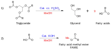 Lipids (triglycerides) themselves can be used as solvents, but are mostly hydrolyzed to fatty acids and glycerol (glycerin). Fatty acids can be esterified with an alcohol to give fatty acid esters, e.g., FAMEs (fatty acid methyl esters) if the esterification is performed with methanol. Usually derived from natural gas or petroleum, the methanol used to produce FAMEs can also be obtained by other routes, including gasification of biomass and household hazardous waste. Glycerol from lipid hydrolysis can be used as a solvent in synthetic chemistry, as can some of its derivatives.[8]