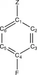 Consider para-disubstituted benzene p-F-C6H4-Z, where Z is a substituent such as NH2, NO2, etc. The fluorine atom is para with respect to the substituent Z in the benzene ring. The image on the right shows four distinguished ring carbon atoms, C1(ipso), C2(ortho), C3(meta), C4(para) in p-F-C6H4-Z molecule. The carbon with Z is defined as C1(ipso) and fluorinated carbon as C4(para). This definition is followed even for Z = H. The left-hand side of (1) is called CEBE shift or ΔCEBE, and is defined as the difference between the CEBE of the fluorinated carbon atom in p-F-C6H4-Z and that of the fluorinated carbon in the reference molecule FC6H5.