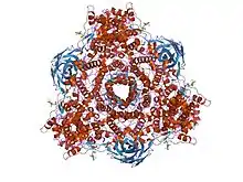 Hexamers are characteristic of arthropod hemocyanins.[17] A hemocyanin of the tarantula Eurypelma californicum[3] is made up of 4 hexamers or 24 peptide chains. A hemocyanin from the house centipede Scutigera coleoptrata[18] is made up of 6 hexamers or 36 chains. Horseshoe crabs have an 8-hexamer (i. e. 48-chain) hemocyanin. Simple hexamers are found in the spiny lobster Panulirus interruptus and the isopod Bathynomus giganteus.[17] Peptide chains in crustaceans are about 660 amino acid residues long, and in chelicerates they are about 625. In the large complexes there is a variety of variant chains, all about the same length; pure components do not usually self-assemble.