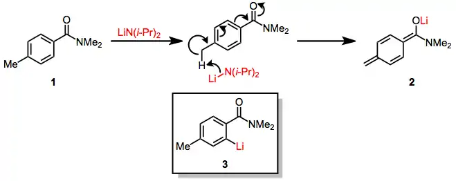 As either the Lewis acidity of the base or the coordinating ability of the substituent decrease, a mechanism involving purely inductive effects becomes more important. For instance, the lithiation of 1 with lithium di(isopropyl)amide (LDA) affords only the product of benzylic metalation 2; none of the ortho-lithiated product 3 is observed. This result is explained by a mechanism in which the amide substituent affects the acidity of the para benzylic position solely through inductive effects and coordination of the base is not operative. Deprotonation occurs to afford the most thermodynamically stable product.[6]