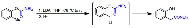 Related O-aryl carbamates are good directing groups; upon warming, the resulting organolithiums undergo rearrangement to benzylic amides (the Snieckus-Fries rearrangement) via migration of the carbonyl carbon from oxygen to carbon.[14]