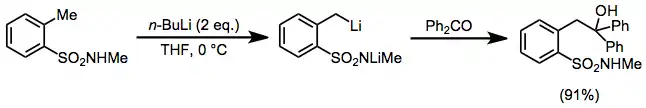 Sulfonamides require two equivalents of an organolithium reagent for lateral lithiation, but represent a useful class of directing groups. Treatment with ketones leads to tertiary alcohols in high yield.[16]