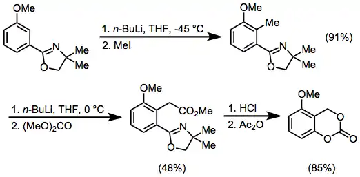 Tertiary amides are highly effective directing groups. After treatment of the resulting benzylic anion with an aldehyde, cyclization leads to lactones.[12] Carboxamides, in which the amide is attached to the aromatic ring through nitrogen rather than carbon, are also effective directing groups.[13]