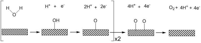 2H2O → O2 + 4H+ + 4e− Oxidation (generation of dioxygen)