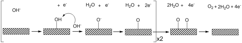 Heterogeneous OER is sensitive to the surface which the reaction takes place and is also affected by the pH of the solution. The general mechanism for acidic and alkaline solutions is shown below. Under acidic conditions water binds to the surface with the irreversible removal of one electron and one proton to form a platinum hydroxide.[4] In an alkaline solution a reversible binding of hydroxide ion coupled to a one electron oxidation is thought to precede a turnover-limiting electrochemical step involving the removal of one proton and one electron to form a surface oxide species.[5] The shift in mechanism between the pH extremes has been attributed to the kinetic facility of oxidizing hydroxide ion relative to water. Using the Tafel equation, one can obtain kinetic information about the kinetics of the electrode material such as the exchange current density and the Tafel slope.[6] OER is presumed to not take place on clean metal surfaces such as platinum, but instead an oxide surface is formed prior to oxygen evolution.[7]