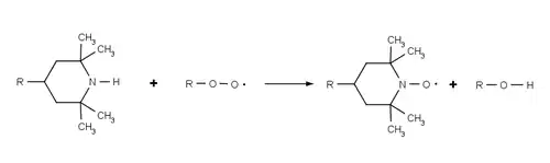 HALS do not absorb UV radiation, but act to inhibit degradation of the polymer by continuously and cyclically removing free radicals that are produced by photo-oxidation of the polymer. The overall process is sometimes referred to as the Denisov cycle, after Evguenii T. Denisov[6] and is exceedingly complex.[7] Broadly, HALS react with the initial polymer peroxy radical (ROO•) and alkyl polymer radicals (R•) formed by the reaction of the polymer and oxygen, preventing further radical oxidation. By these reactions HALS are oxidised to their corresponding aminoxyl radicals (R2NO• c.f. TEMPO), however they are able to return to their initial amine form via a series of additional radical reactions. HALS's high efficiency and longevity are due to this cyclic process wherein the HALS are regenerated rather than consumed during the stabilization process.