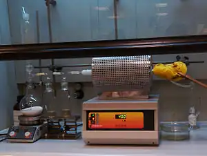 Using a mortar and pestle or ball mill, the reactants are ground together, which decreases size and increases surface area of the reactants.[8] If the mixing is not sufficient, we can use techniques such as co-precipitation and sol-gel.[7] A chemist forms pellets from the ground reactants and places the pellets into containers for heating.[7] The choice of container depends on the precursors, the reaction temperature and the expected product.[7] For example, metal oxides are typically synthesized in silica or alumina containers.[7] A tube furnace heats the pellet.[7] Tube furnaces are available up to maximum temperatures of 2800oC.[9]