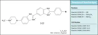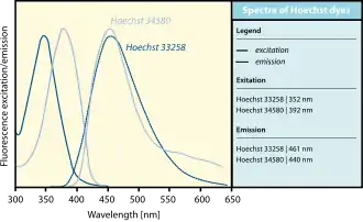 Hoechst stains are part of a family of blue fluorescent dyes used to stain DNA.[1][2] These bis-benzimides were originally developed by Hoechst AG, which numbered all their compounds so that the dye Hoechst 33342 is the 33,342nd compound made by the company. There are three related Hoechst stains: Hoechst 33258, Hoechst 33342, and Hoechst 34580. The dyes Hoechst 33258 and Hoechst 33342 are the ones most commonly used and they have similar excitation–emission spectra.