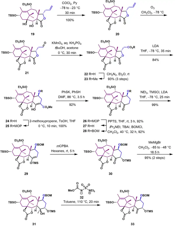As shown in Scheme 3, diol 19 was protected with phosgene as a carbonate ester (20). The terminal alkene group of 20 was next converted to a methyl ester using ozonolysis followed by oxidation with potassium permanganate and esterification with diazomethane. Ring expansion to give the cyclohexane C ring 24 was achieved using a Dieckman condensation of lactone 23 with lithium diisopropylamide as a base at -78 °C. Decarboxylation of 24 required protection of the hydroxyl group as the 2-methoxy-2-propyl (MOP) ether (25). With the protecting group in place, decarboxylation was effected with potassium thiophenolate in dimethylformamide to give protected hydroxy ketone 26. In the next two steps the MOP protecting group was removed under acidic conditions, and alcohol 27 was reprotected as the more robust benzyloxymethyl ether 28. The ketone was converted to the trimethylsilyl enol ether 29, which was subsequently oxidized in a Rubottom oxidation using m-chloroperbezoic acid to give the trimethylsilyl protected acyloin 30. At this stage the final missing carbon atom in the Taxol ring framework was introduced in a Grignard reaction of ketone 30 using a 10-fold excess of methylmagnesium bromide to give tertiary alcohol 31. Treatment of this tertiary alcohol with the Burgess reagent (32) gave exocyclic alkene 33.