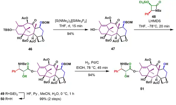 In the final stages of the synthesis (Scheme 5), the hydroxyl group in 46 was deprotected to give alcohol 47. Reaction of the lithium alkoxide of 47 with the Ojima lactam 48 adds the tail in 49. Deprotection of the triethylsilyl ether with hydrofluoric acid and removal of the BOM group under reductive conditions gave (−)-Taxol 51 in 46 steps.