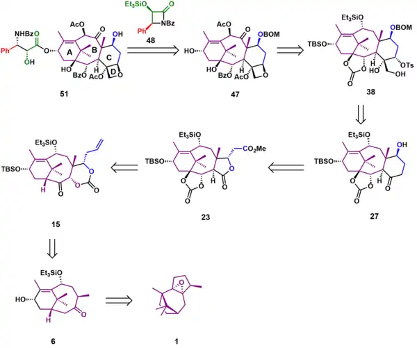 It was envisaged that Taxol (51) could be accessed through tail addition of the Ojima lactam 48 to alcohol 47. Of the four rings of Taxol, the D ring was formed last, the result of a simple intramolecular SN2 reaction of hydroxytosylate 38, which could be synthesized from hydroxyketone 27. Formation of the six-membered C ring took place through a Dieckmann condensation of lactone 23, which could be obtained through a Chan rearrangement of carbonate ester 15. Substrate 15 could be derived from ketone 6, which, after several oxidations and rearrangements, could be furnished from commercially available patchoulene oxide 1.
