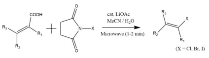 For unsaturated conmpounds, the radical conditions associated with the Hunsdiecker reaction can also induce polymerization instead of decarboxylation.[12]: 468 Consequently, reactions with α,β-unsaturated carboxylic acids typically give low yield.[11] Kuang et al have found that an alternate radical halogenating agent, N-halosuccinimide, combined with a lithium acetate catalyst, gives a higher yield of β-halostyrenes. The reaction also improves in the presence of microwave irradiation, which preferentially synthesizes (E)-β-arylvinyl halides.[19]