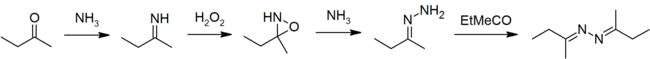 - 2 (CH3)2CO + N2H4 → 2 H2O + ((CH3)2C=N)2