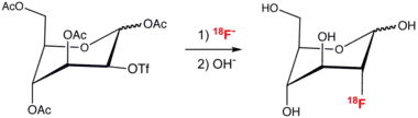 The usefulness of fluorine-containing radiopharmaceuticals in 18F-positron emission tomography has motivated the development of new methods for forming C–F bonds. Because of the short half-life of 18F, these syntheses must be highly efficient, rapid, and easy.[25] Illustrative of the methods is the preparation of fluoride-modified glucose by displacement of a triflate by a labeled fluoride nucleophile: