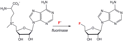 In contrast to the many naturally-occurring organic compounds containing the heavier halides, chloride, bromide, and iodide, only a handful of biologically synthesized carbon-fluorine bonds are known.[39] The most common natural organofluorine species is fluoroacetate, a toxin found in a few species of plants. Others include fluorooleic acid, fluoroacetone, nucleocidin (4'-fluoro-5'-O-sulfamoyladenosine), fluorothreonine, and 2-fluorocitrate. Several of these species are probably biosynthesized from fluoroacetaldehyde. The enzyme fluorinase catalyzed the synthesis of 5'-deoxy-5'-fluoroadenosine (see scheme to right).