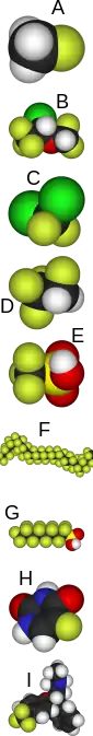 Biologically synthesized organofluorines have been found in microorganisms and plants, but not animals.[26] The most common example is fluoroacetate, which occurs as a plant defence against herbivores in at least 40 plants in Australia, Brazil and Africa.[27] Other biologically synthesized organofluorines include ω-fluoro fatty acids, fluoroacetone, and 2-fluorocitrate which are all believed to be biosynthesized in biochemical pathways from the intermediate fluoroacetaldehyde.[26] Adenosyl-fluoride synthase is an enzyme capable of biologically synthesizing the carbon–fluorine bond.[28] Man made carbon–fluorine bonds are commonly found in pharmaceuticals and agrichemicals because it adds stability to the carbon framework; also, the relatively small size of fluorine is convenient as fluorine acts as an approximate bioisostere of the hydrogen. Introducing the carbon–fluorine bond to organic compounds is the major challenge for medicinal chemists using organofluorine chemistry, as the carbon–fluorine bond increases the probability of having a successful drug by about a factor of ten.[29] An estimated 20% of pharmaceuticals, and 30–40% of agrichemicals are organofluorines, including several of the top drugs.[29] Examples include 5-fluorouracil, fluoxetine (Prozac), paroxetine (Paxil), ciprofloxacin (Cipro), mefloquine, and fluconazole.