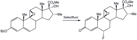 Electrophilic fluorination rely on sources of "F+". Often such reagents feature N-F bonds, for example F-TEDA-BF4. Asymmetric fluorination, whereby only one of two possible enantiomeric products are generated from a prochiral substrate, rely on electrophilic fluorination reagents.[13] Illustrative of this approach is the preparation of a precursor to anti-inflammatory agents:[14]