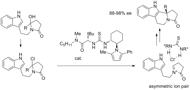One of the first reactions proposed to proceed through anion-binding catalysis is the Pictet-Spengler-type cyclization of hydroxylactams with TMSCl under thiourea catalysis.[12] In the proposed mechanism, after initial substitution of the hydroxyl group with chloride, the key ion pair is formed. The activated iminium ion is closely associated with the chiral thiourea-bound chloride, and intramolecular cyclization proceeds with high stereoselectivity.