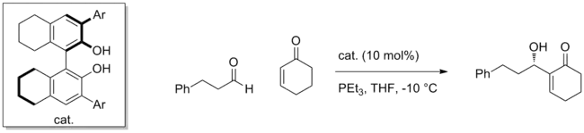 Many synthetic catalysts employ this strategy to activate a variety of electrophiles. Using a chiral BINOL catalyst, for instance, the Morita-Baylis-Hillman reaction involving the addition of enones to aldehydes can be effected with high enantioselectivity.[5] The nucleophile is an enolate-type species generated from the conjugate addition of PEt3 to the enone, and adds enantioselectively to the aldehyde coordinated to catalyst.