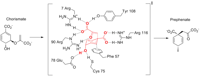 For instance, the natural enzyme chorismate mutase, which catalyzes the Claisen rearrangement of chorismate, features many other interactions in addition to the hydrogen bonds involved in stabilizing the enolate-like fragment, which is an example of the anionic fragment stabilization strategy discussed above.[17] A key interaction is the stabilization of the other cationic allyl fragment through a cation-pi interaction in the transition state. The use of many additional hydrogen bonds has several putative purposes. The stabilization of multiple hydrogen bonds to the enzyme helps overcome the entropic cost of binding. Additionally, the interactions help hold the substrate in a reactive conformation, and the enzyme-catalyzed reaction has near-zero entropy of activation, while typical Claisen rearrangements in solution have very negative entropies of activation.