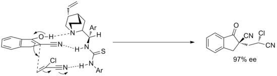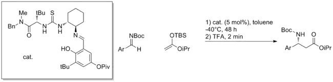 In addition to carbonyls, other electrophiles such as imines can be used. For example, using a simple chiral thiourea catalyst, the asymmetric Mannich reaction of aromatic imines with silyl ketene acetals can be catalyzed with high ee in near quantitative conversion.[6] The mechanism of this reaction is not fully resolved and the reaction is very substrate-specific, only effective on certain aromatic electrophiles.