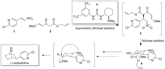 In 2008, Takemoto disclosed a concise synthesis of (−)-epibatidine that relied on a Michael cascade, catalyzed by a bifunctional catalyst.[31] After initial asymmetric Michael addition to the β-nitrostyrene, intramolecular Michael addition furnishes the cyclic ketoester product in 75% ee. Standard functional group manipulations and an intramolecular cyclization yields the natural product.