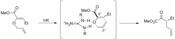 A demonstrative example is the catalysis of Claisen rearrangements of ester-substituted allyl vinyl ethers reported by the Jacobsen research group.[9] A chiral guanidinium catalyst was found to promote the reaction near room temperature with high enantioselectivity. During the transition state, the fragment coordinated to the amidinium catalyst develops partial anionic character due to the electronegativity of the oxygen and the electron-withdrawing ester group. This increases the strength of hydrogen bonding and lowers the transition state energy, thus accelerating the reaction.