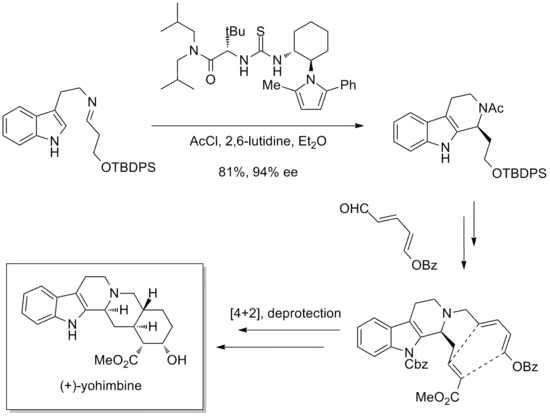 In the Jacobsen synthesis of (+)-yohimbine,[30] an indole alkaloid, an early enantioselective Pictet-Spengler reaction using a pyrrole-substituted thiourea catalyst produced gram-scale quantities of product in 94% ee and 81% yield. The remainder of the synthesis was short, using a reductive amination and an intramolecular Diels-Alder reaction.
