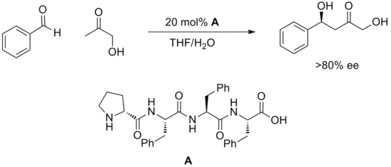 A relatively new strategy of using synthetic oligopeptides to perform catalysis has yielded many examples of catalytic methods.[20] Peptides feature multiple potential sites for hydrogen bonding and it is generally not understood how these engage substrate or how they promote reaction. Peptides have the advantage of being extremely modular and often these catalysts are screened in large arrays. Highly enantioselective reactions have been discovered in this manner such as the aldol reaction depicted below.