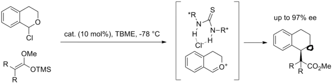 Asymmetric ion pairs can also be attacked in intermolecular reactions. In an interesting example, asymmetric addition of enol silane nucleophiles to oxocarbenium ions can be effected by catalytically forming the oxocarbenium through anion binding.[13] Starting from an acetal, the chloroether is generated with boron trichloride and reacted with the enol silane and catalyst. The mechanism of formation of the oxocarbenium-thiourea-chloride complex is not fully resolved. It is thought that under the reaction conditions, the chloroether can epimerize and thiourea can stereoselectively bind chloride to form a closely associated ion pair. This asymmetric ion pair is then attacked by the silane to generate alkylated product.