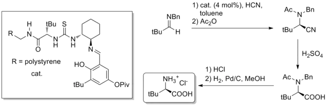 Aside from total synthesis, hydrogen-bond catalysis has been applied to the bulk synthesis of difficult-to-access chiral small molecules. An example is the gram-scale Strecker synthesis of unnatural amino acids using thiourea catalysis, reported in the journal Nature in 2009.[32] The catalyst, whether polymer-bound or homogeneous, is derived from natural tert-leucine and can catalyze (4 mol% catalyst loading) the formation of the Strecker product from benzhydryl amines and aqueous HCN. Hydrolysis of the nitrile and deprotections produces pure unnatural tert-leucine in 84% overall yield and 99% ee.