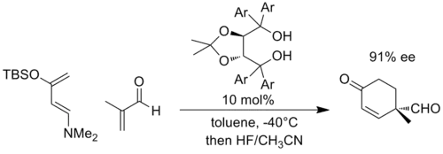 Similarly, negative charge can develop in cycloaddition reactions such as the Diels-Alder reaction, when the partners are appropriately substituted. As a representative example, Rawal and coworkers developed a chiral catalyst based on α,α,α,α-tetraaryl-1,3-dioxolane-4,5-dimethanol (TADDOL) that could catalyze Diels-Alder reactions. In the following example, the reaction with a highly electron-rich diene and an electron-poor dienophile is thought to develop significant negative charge on the enal fragment, and is the transition state is stabilized by increased hydrogen bonding to the TADDOL (Ar = 1-naphthyl).[10]