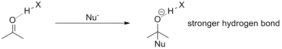 For example, in a typical acyl substitution reaction, the starting carbonyl compound is coordinated to the catalyst through one, two or possibly more hydrogen bonds. During the attack of the nucleophile, negative charge builds on the oxygen until the tetrahedral intermediate is reached. Therefore, the formally negative oxygen engages in a much stronger hydrogen bond than the starting carbonyl oxygen because of its increased negative charge. Energetically, this has the effect of lowering the intermediate and the transition state, thus accelerating the reaction.