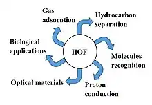 The porous structures and unique properties guarantee HOFs good application performance in practical fields. The applications include but are not limited to gas adsorption, hydrocarbon separation, proton conductivity, and molecular recognition, etc.