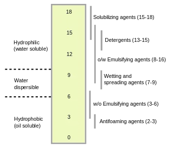 where is the molecular mass of the hydrophilic portion of the molecule, and M is the molecular mass of the whole molecule, giving a result on a scale of 0 to 20. An HLB value of 0 corresponds to a completely lipophilic/hydrophobic molecule, and a value of 20 corresponds to a completely hydrophilic/lipophobic molecule.