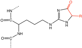 4-imidazolones are advanced glycation endproducts (AGEs), a class of modified proteins that are biomarkers for diabetes. In this drawing the imidazolone is the C3N2 ring in red and black.[1]