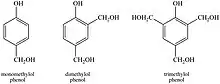 Phenol-formaldehyde resins (PF) were the first commercially relevant impregnation resins, made by reacting phenol and formaldehyde, creating a polymer network inside of the wood upon curing.[7] Phenol can react with formaldehyde at the ortho and para positions, generating mono, di, and trimethylolphenol as the reaction products.[6] Besides being the first synthetic polymers to be commercialized,[7] studies show that PF resins have superior performance over other resins in terms of imparting strength, stability, and decay resistance to the wood substrate.[1] The dimensional stability displayed by the wood samples impregnated with PF resins is mostly a function of the mass of resin inside the wood cell wall.[8][9][10] PF impregnated wood is sometimes called impreg. Before curing, PF resins act as cell wall plasticizer, allowing wood to be compressed more easily. After cure, the PF prevents wood from springing back. This has been used to make high density, very hard wood products, known as “compreg” or “staybwood”.[11] The increase in both strength and stability of the wood is due to the cross-linking of the resin components and the resin's ability to bulk the cell wall. PF is black, obscuring any natural color of the wood.