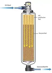 The most common industrial EIE process forces the liquid fat feedstock through a fixed-bed reactor that typically contains an oil purification bed followed by an enzyme bed. The latter has the enzyme fixed on some inert granular substrate. The first bed removes impurities from the oil blend that could inactivate the enzyme or affect its performance. The enzyme activity decreases over time, so flow must be carefully monitored and adjusted over time to maintain conversion. [5]
