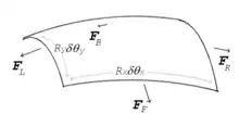 If no force acts normal to a tensioned surface, the surface must remain flat. But if the pressure on one side of the surface differs from pressure on the other side, the pressure difference times surface area results in a normal force. In order for the surface tension forces to cancel the force due to pressure, the surface must be curved. The diagram shows how surface curvature of a tiny patch of surface leads to a net component of surface tension forces acting normal to the center of the patch. When all the forces are balanced, the resulting equation is known as the Young–Laplace equation:[11]