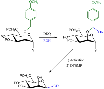 In this method, the glycosyl donor is protected at C-2 by a para-methoxybenzyl (PMB) group. The glycosyl acceptor is then tethered at the benzylic position of the PMB protecting group in the presence of 2,3-Dichloro-5,6-dicyano-1,4-benzoquinone (DDQ). The anomeric leaving group (Y) is then activated, and the developing oxocarbenium ion is captured by the tethered aglycon alcohol (OR) to give 1,2-cis β-glycoside product.[5]