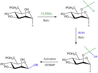 A modified silicon-tethering method involves mixing of the glycosyl donor with the glycosyl acceptor and dimethyldichlorosilane in the presence of imidazole to give the mixed silaketal in one pot. Activation of the tethered intermediate then leads to the β-glycoside product.[8]