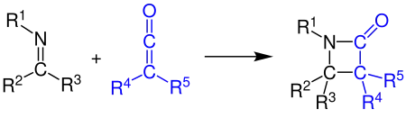 Ketenes can react with alkenes, carbonyl compounds, carbodiimides and imines in a [2+2] cycloaddition. The example shows the synthesis of a β-lactam by the reaction of a ketene with an imine (see Staudinger synthesis):[10][11]
