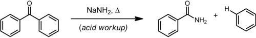 - With sodium amide resulting in C–C bond cleavage with formation of the amide RCONH2 and the alkane or arene R'H, a reaction called the Haller–Bauer reaction.[21]