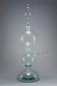 A Döbereiner's lamp is a small modified Kipp's apparatus for production of hydrogen. The hydrogen is led over a platinum sponge catalyst, where it reacts with air oxygen, heats the catalyst and ignites from it, producing a gentle flame. It was commercialized for lighting fires and pipes. It's said that in 1820s over a million of the "tinderboxes" ("Feuerzeug") was sold.[5]