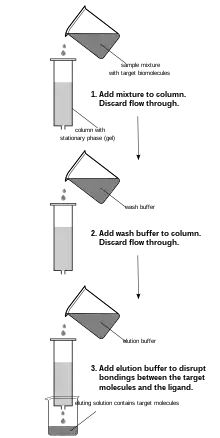 Affinity chromatography has the advantage of specific binding interactions between the analyte of interest (normally dissolved in the mobile phase), and a binding partner or ligand (immobilized on the stationary phase). In a typical affinity chromatography experiment, the ligand is attached to a solid, insoluble matrix—usually a polymer such as agarose or polyacrylamide—chemically modified to introduce reactive functional groups with which the ligand can react, forming stable covalent bonds.[4] The stationary phase is first loaded into a column to which the mobile phase is introduced. Molecules that bind to the ligand will remain associated with the stationary phase. A wash buffer is then applied to remove non-target biomolecules by disrupting their weaker interactions with the stationary phase, while the biomolecules of interest will remain bound. Target biomolecules may then be removed by applying a so-called elution buffer, which disrupts interactions between the bound target biomolecules and the ligand. The target molecule is thus recovered in the eluting solution.[5]