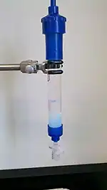 A chromatography column containing nickel-agarose beads used for purification of proteins with histidine tags