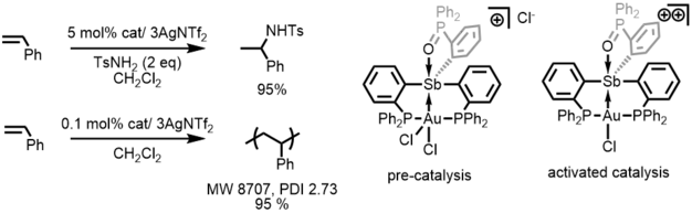 Lewis acidic antimony compounds can act as Z-type ligands. Owing to the strong σ-accepting ability of dicationic Sb ligand, a gold-antimony complex can catalyze styrene polymerization and hydroamination after being activated by AgNTf2.[21]