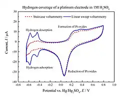 In analytical chemistry, linear sweep voltammetry is a method of voltammetry where the current at a working electrode is measured while the potential between the working electrode and a reference electrode is swept linearly in time.[1][2] Oxidation or reduction of species is registered as a peak or trough in the current signal at the potential at which the species begins to be oxidized or reduced.